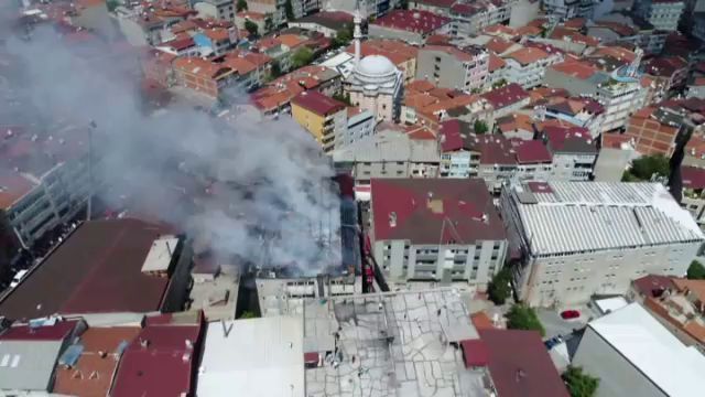 Tekstil atölyesindeki yangın havadan görüntülendi